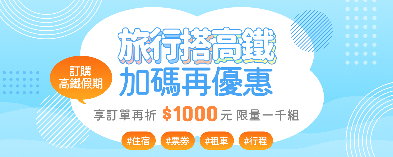 高鐵票加上精心挑選的一日遊或主題行程享超值優惠價!從 本島杉林溪、九族日月潭、墾丁、阿里山,到外島小琉球、澎湖 ,不用自己規劃即可輕鬆體驗在地文化與熱門景點,歡樂不打烊。