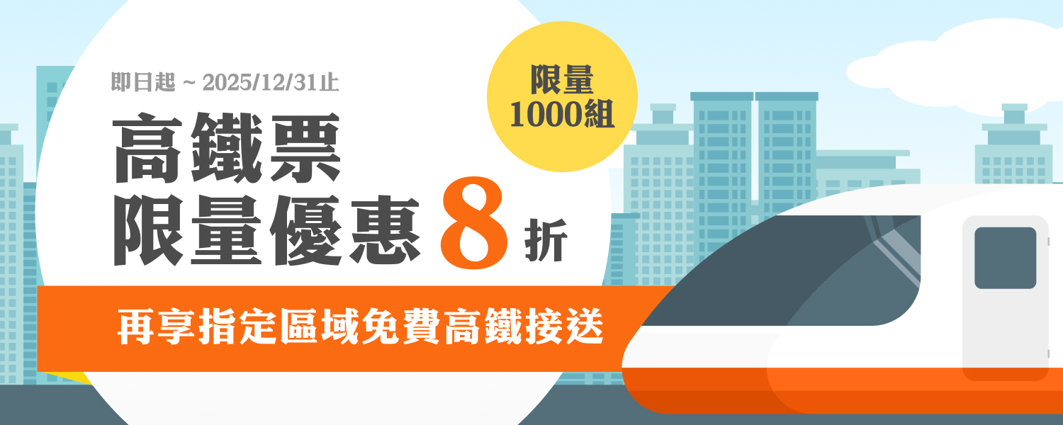 肯驛限量套裝商品,自由選擇高鐵接送。限時限量高鐵票 8 折起優惠 + 免費 2 趟高鐵站至市區往返專車接送服務,讓你出遊省時又便利。(雲林及嘉義地區目前暫無接送服務) (高鐵雙程接送注意事項)