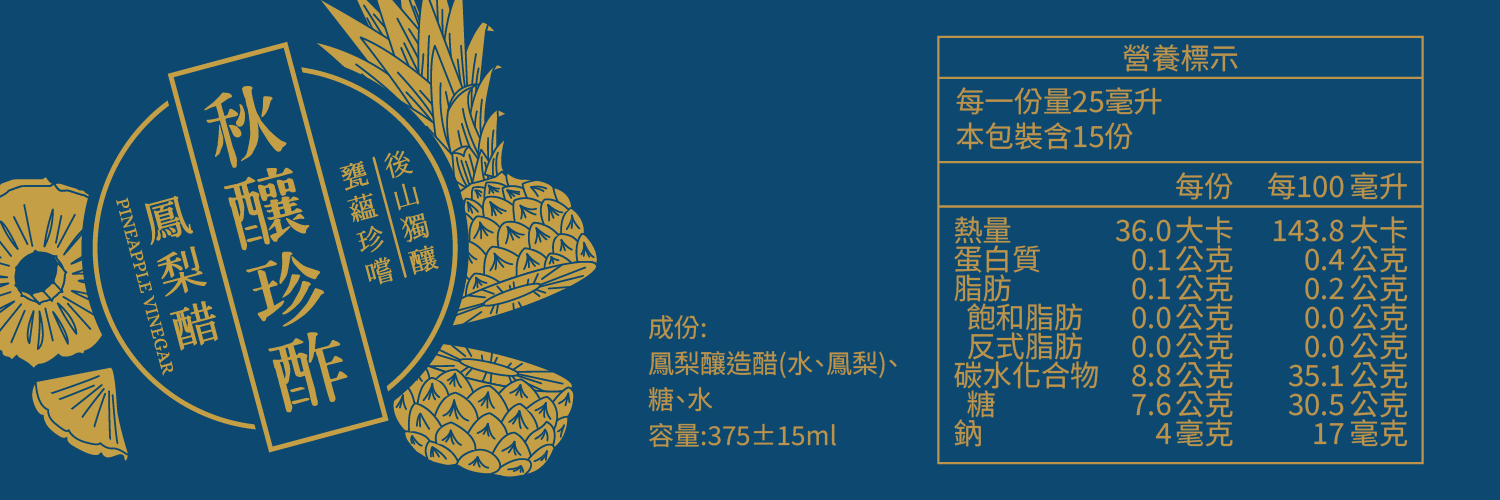 商品規格 .品名:秋釀珍酢鳳梨醋 .規格:375ml .成分:鳳梨釀造醋、糖、水 .規格:375ml .保存期限:3年 .產地:台東 .食品業者登錄字號:V-156225500-00000-4
