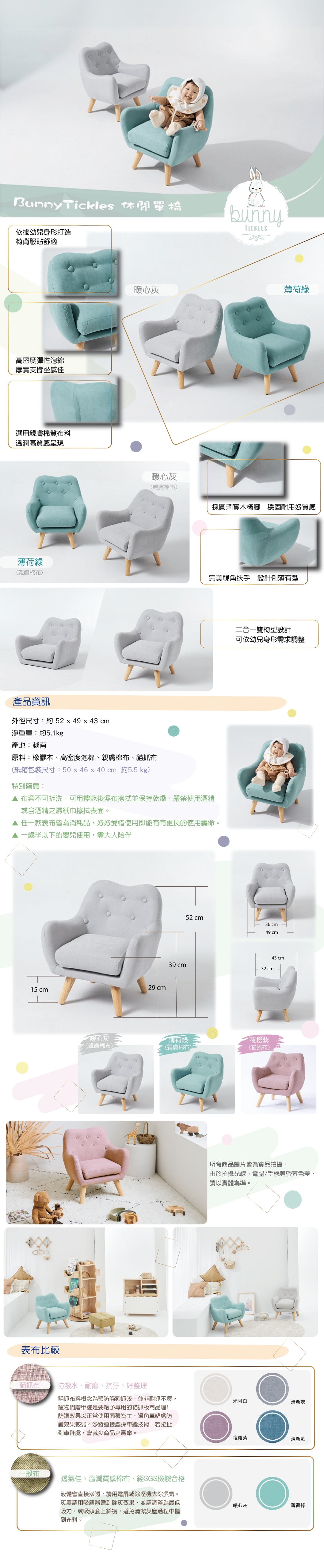 商品規格 .品名:BunnyTickles兒童休閒單椅 .材質:橡膠木、高密度泡棉、沙發棉布 .產地:越南 (澳洲設計) .耐重:約80公斤 .尺寸 : 52*49*43cm .重量 : 約5.1kg .外箱包裝 : 50*46*40 / 約5.5kg