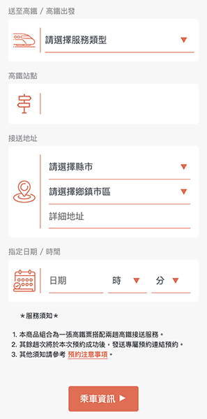 司機及車輛相關資訊將於服務日前一天 18:00 後以簡訊通知,並於預約時間準時在指定地點等候。