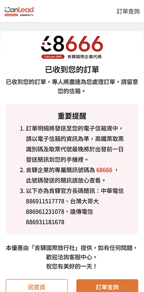 在肯驛旅遊平台 OTA /福委會平台/點數平台,訂購全球機票成功即可加購高鐵票 8 折優惠。