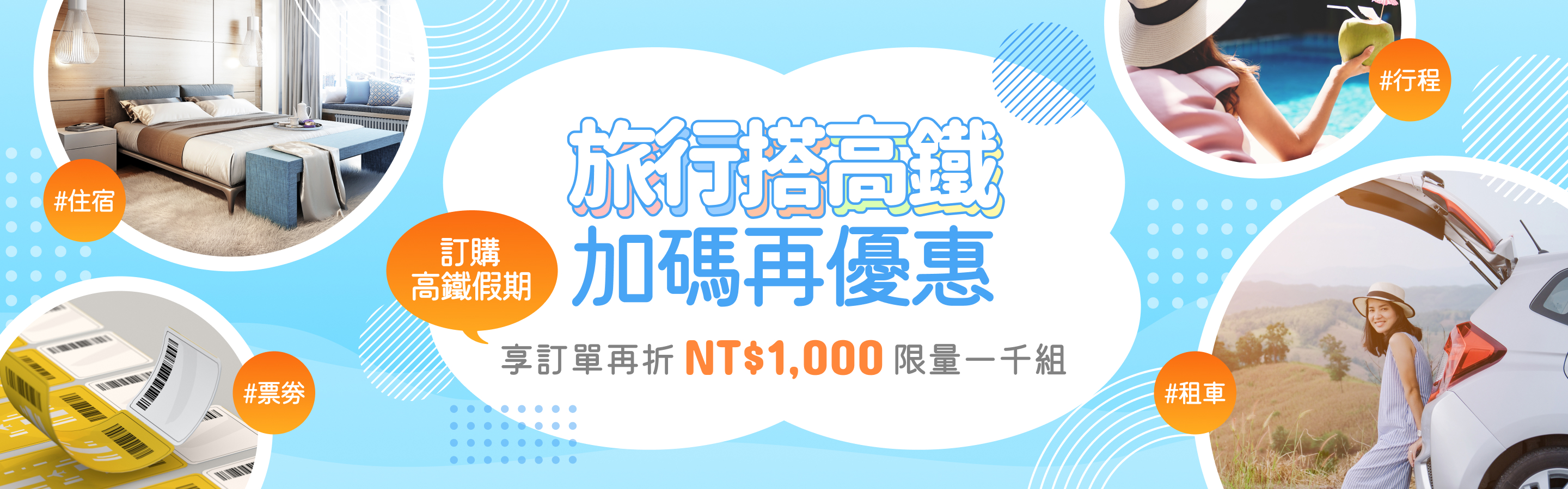 高鐵票加上精心挑選的一日遊或主題行程享超值優惠價!從 本島杉林溪、九族日月潭、墾丁、阿里山,到外島小琉球、澎湖 ,不用自己規劃即可輕鬆體驗在地文化與熱門景點,歡樂不打烊。