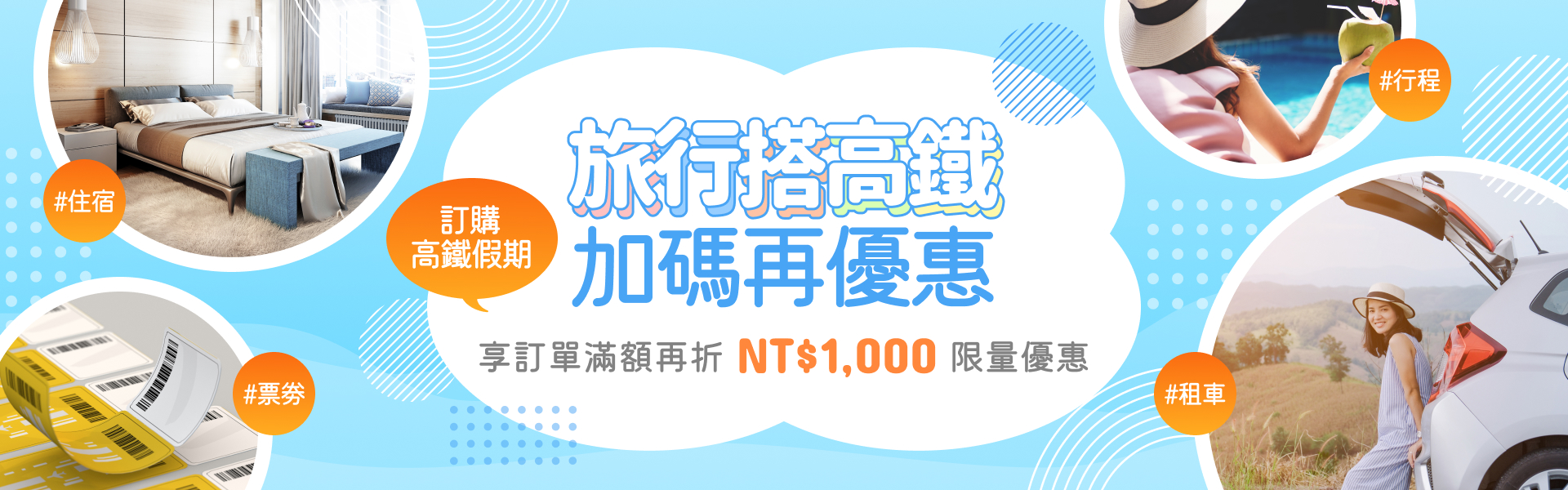 高鐵票加上精心挑選的一日遊或主題行程享超值優惠價!從 本島杉林溪、九族日月潭、墾丁、阿里山,到外島小琉球、澎湖 ,不用自己規劃即可輕鬆體驗在地文化與熱門景點,歡樂不打烊。