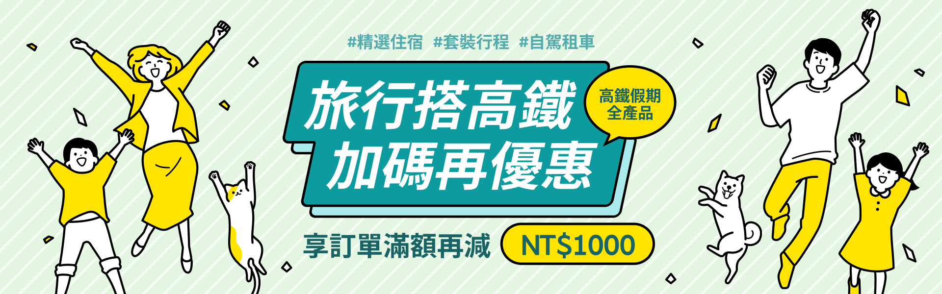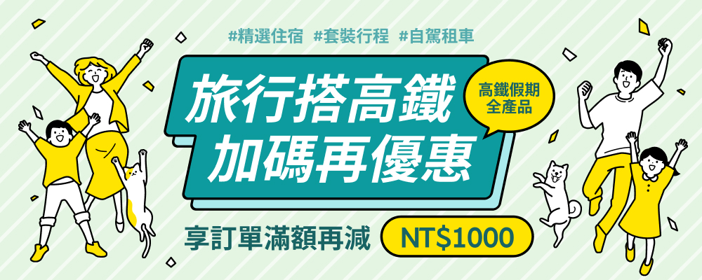 高鐵票加上精心挑選的一日遊或主題行程享超值優惠價!從 本島杉林溪、九族日月潭、墾丁、阿里山,到外島小琉球、澎湖 ,不用自己規劃即可輕鬆體驗在地文化與熱門景點,歡樂不打烊。