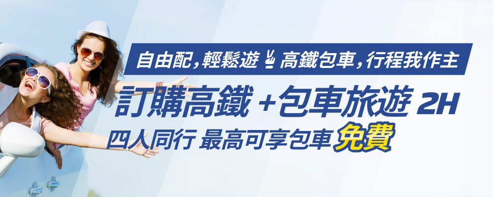 肯驛限量套裝商品,高鐵票+專屬包車旅遊兩小時起,四人成行最高可享免費搭乘,全台各高鐵站皆可安排,到站即上車! 讓你旅程無縫接軌更輕鬆,不須擔心旅遊走錯路。